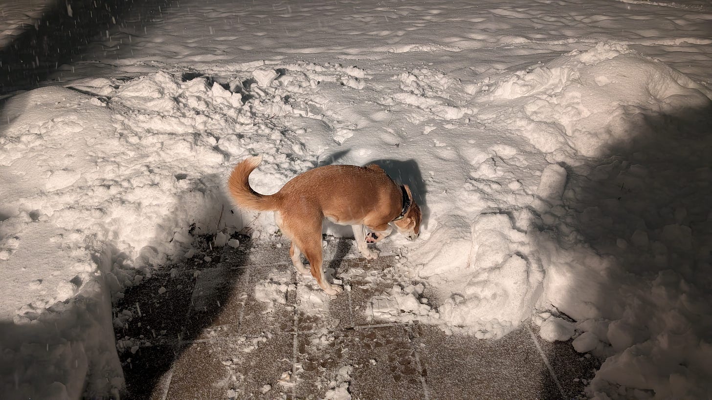 The dog loves it. She sprints around with no issues at all. She was out before trying to catch snow in her mouth. We’ll see how she does tomorrow morning because the worst of it is supposed to happen overnight. Her path is already cleared but I have a sneaking suspicion she is not going to want to come in at all.